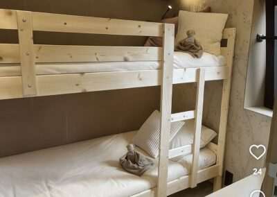 De houten gevelbekleding in natuurlijke tinten, een combinatie van zwart gebrand hout en naturel thermohout, geeft deze Glamping Pod een warme en moderne uitstraling. Het slimme, modulaire ontwerp met metalen frame biedt flexibiliteit en persoonlijk maatwerk: denk aan een extra slaapkamer, yogaruimte of open loft-indeling.